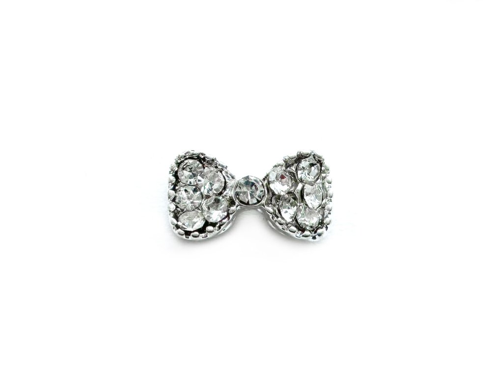 Kovové 3D zdobenie na nechty - strieborná mašlička s čírymi kamienkami, zaoblené rožky a tvar mašličky pre ľahké uchytenie na necht.