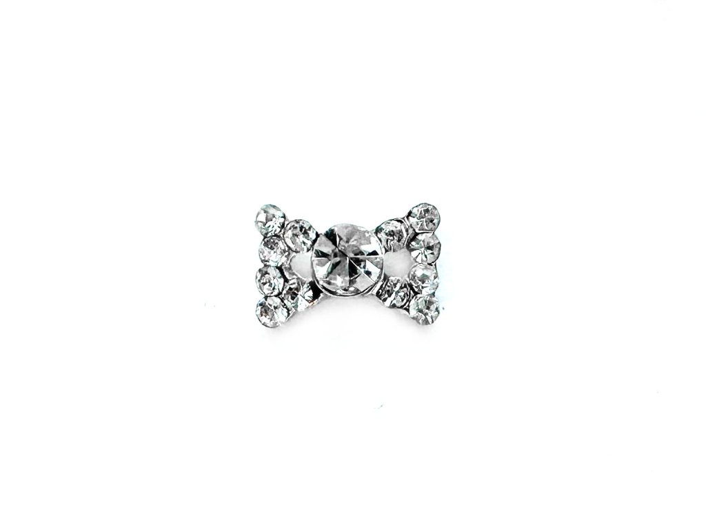 Kovové 3D zdobenie na nechty - strieborná mašlička s veľkým čírym kamienkom uprostred a malými kamienkami okolo.