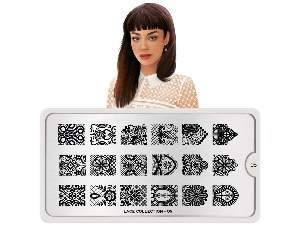 > MoYou destička Lace 05 z nerezové oceli obsahuje 18 rozdílných motivů, každý o rozměru 1.2 x 1.5 cm.