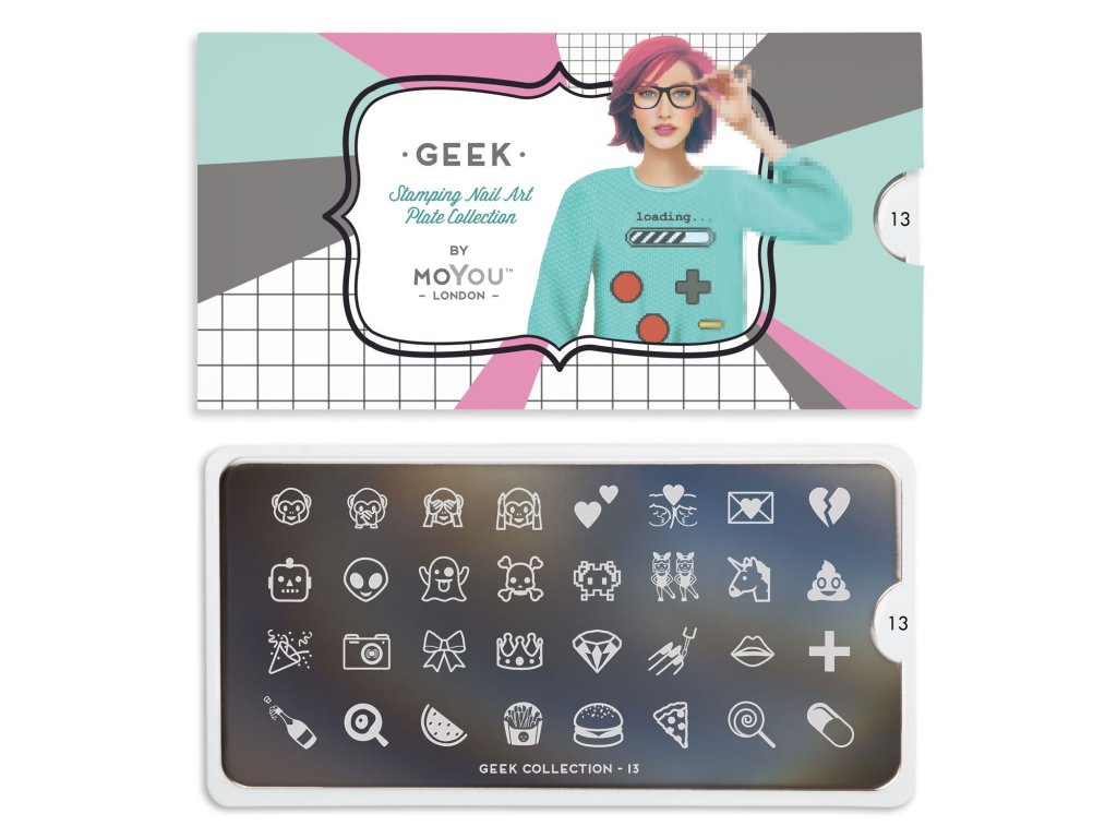 > MoYou-London Geek 13 obsahuje 1 veľký dizajn na doštičke o rozmeroch 10.5 x 4,7 cm v rôznych veľkostiach.
