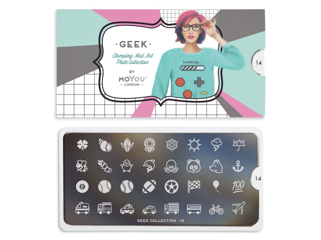 > MoYou-London Geek 14 obsahuje 1 veľký dizajn na doštičke o rozmeroch 10.5 x 4,7 cm v rôznych veľkostiach.