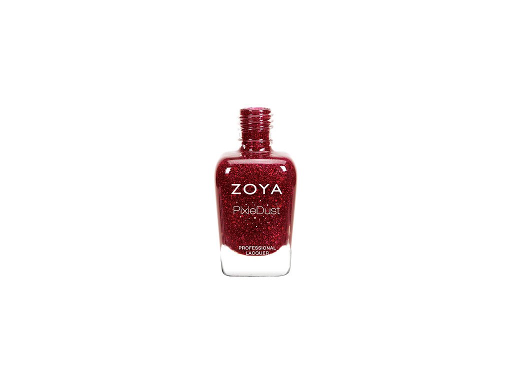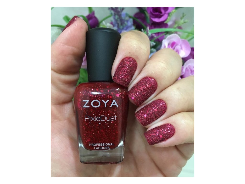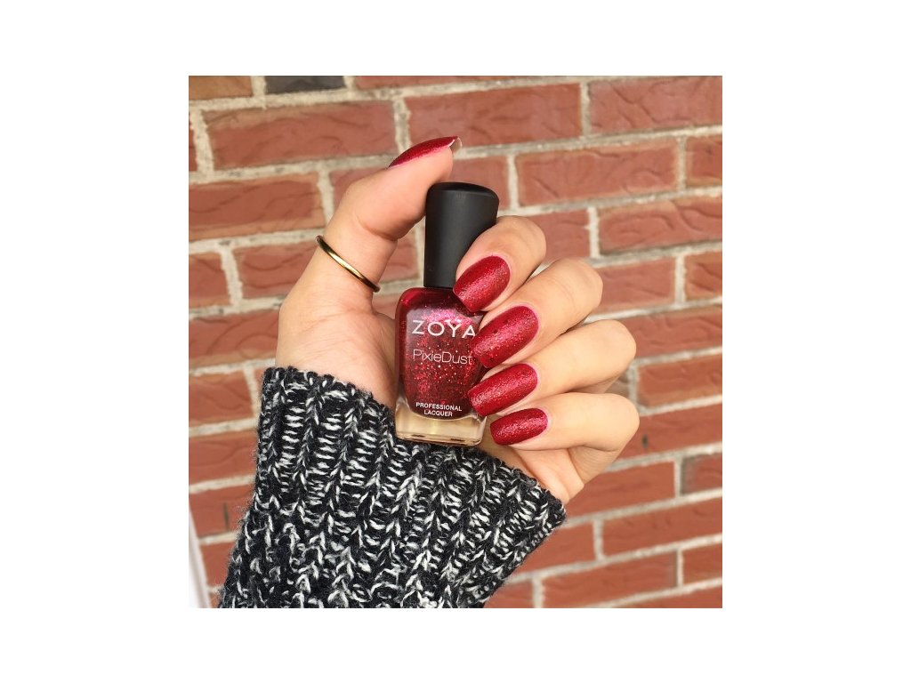 Oswin značky Zoya možno najlepšie popísať ako pravú červenú s PixieDust efektom a karmínovými hexa časticami.