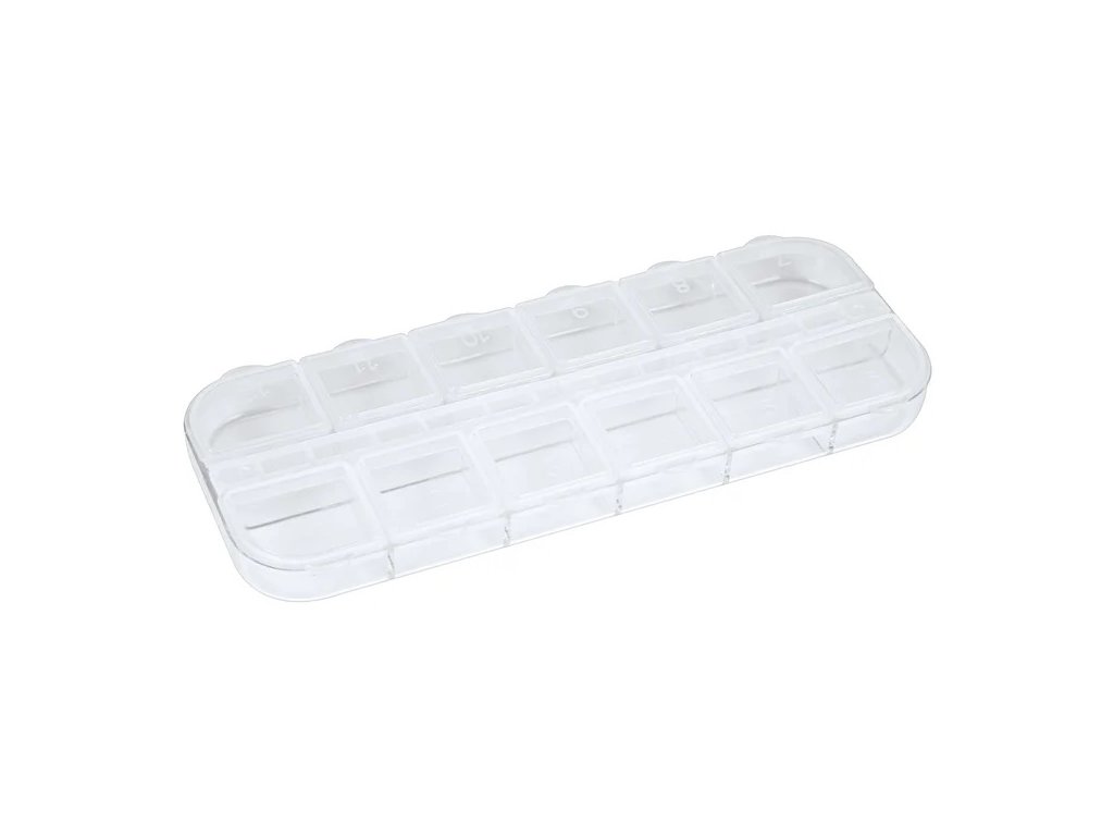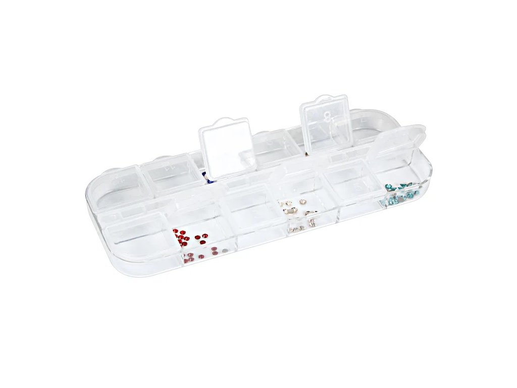Plastový box s dvanástimi uzatvárateľnými priehradkami na zdobenie alebo iné drobné predmety.