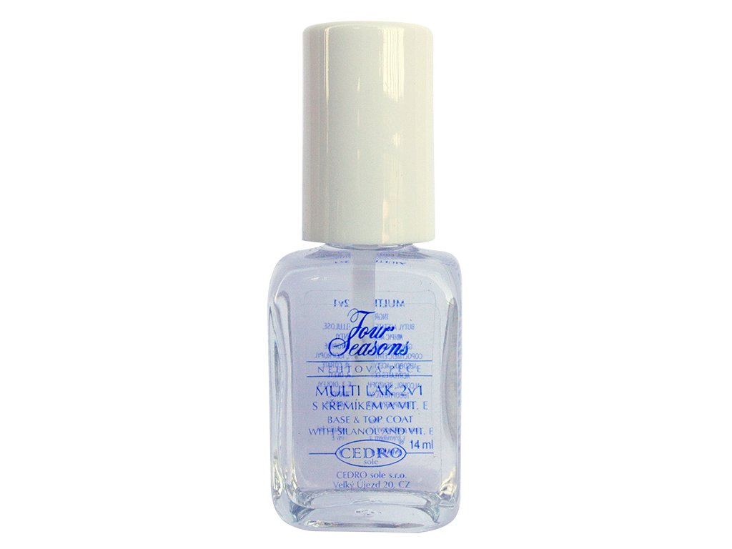 Multi lak 2v1 - Base & top FOUR SEASONS s kremíkom a vitamínom E je univerzálny lak, ktorý slúži ako ochranná podkladová aj krycia vrstva. Multi lak obsahuje zlúčeniny kremíka, ktorý vyrovnáva nerovnosti, posilňuje nechty a podporuje ich rast. Nechty sú potom pružné a pevné. Vitamín E podporuje regeneráciu nechtov a chráni nechty pred UV žiarením. Pri aplikácii na nechty nalakované farebným lakom vytvára vysoko lesklú a pevnú vrstvu chrániacu farebný lak.